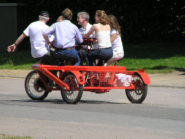 Nach 45 minütiger Fahrt und kurzem Zwischenstopp geht es weiter auf dem 6-Teambike, einem großen Dreirad, auf dem Sie mit 6 Personen um einen Tisch herum sitzen und strampeln.