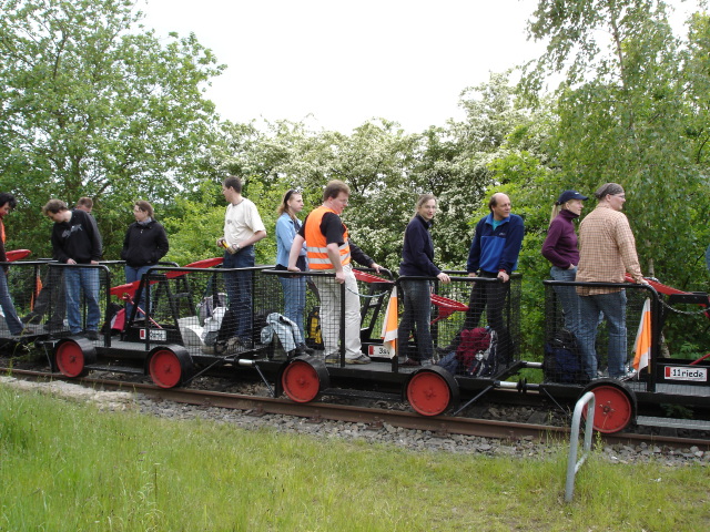 Zur Begrüßung bekommen Sie in einer Straßenbahn ein Frühstück serviert. Anschließend pumpen Sie mit neuartigen Handhebel-Draisinen auf einer stillgelegten Bahnstrecke bis nach Hollenbek und wieder zurück. Bis zu 14 Personen passen auf eine Draisine.
